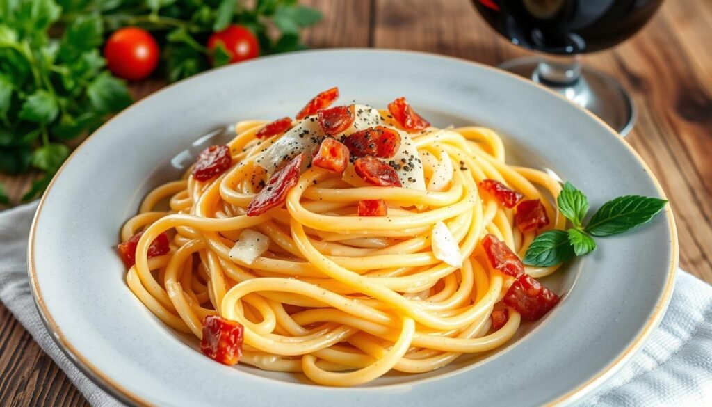 Spaghetti Carbonara is a classic Italian dish from Rome. It’s loved for its mix of flavors. The dish has al dente spaghetti covered in a creamy sauce.