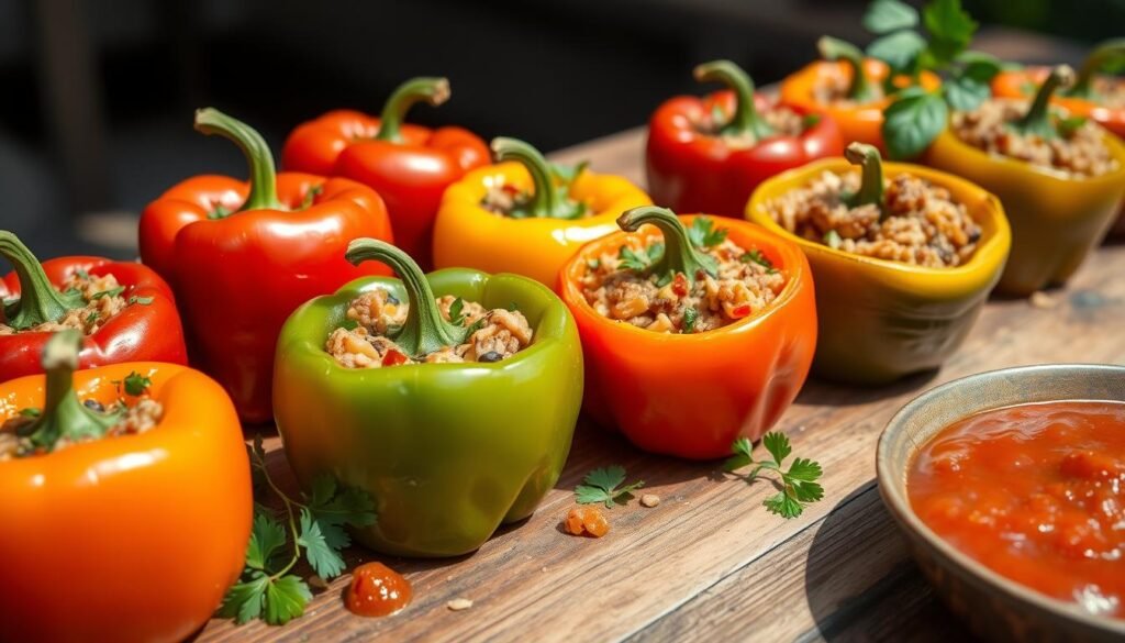 Stuffed bell peppers are very flexible. You can fill them with many things like grains, meats, and herbs. This makes them a favorite dish for many, bringing people closer through food.